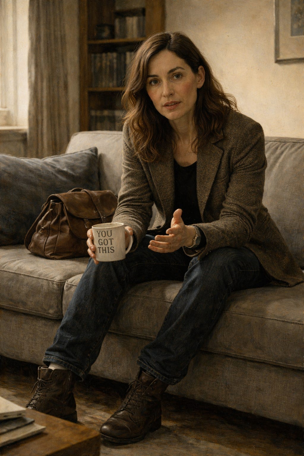 Ruth took in the space in one long glance: the clean-but-not-deliberate kitchen, the groceries aligned with faintly neurotic care, the absence of chaos where chaos normally bloomed.